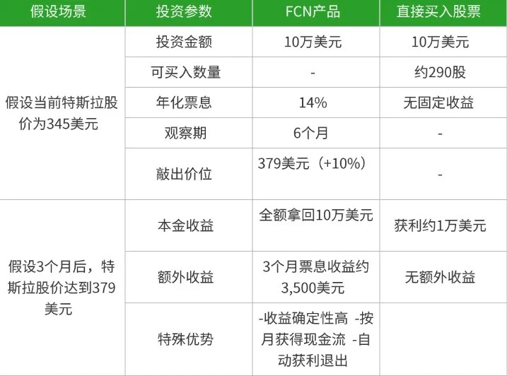 让我们通过一个表格来对比股价上涨时,直接买入特斯拉股票和FCN两种投资方式的收益情况。假设初试投资金额都是10万美元: