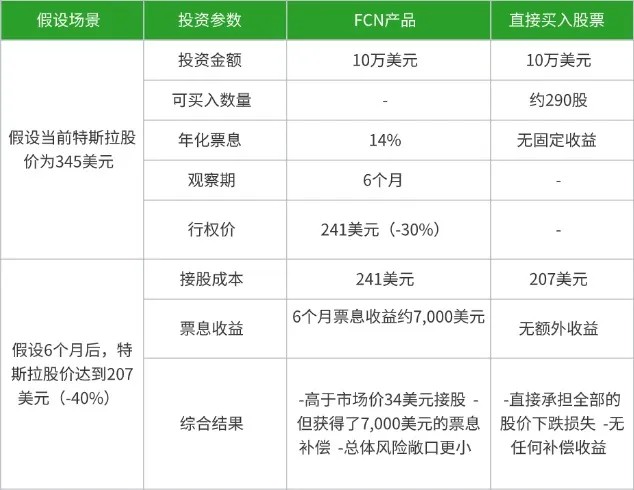 比如现在特斯拉股价是345美元,投资者可以买一个行权价为241美元(比现价低30%)的FCN产品。