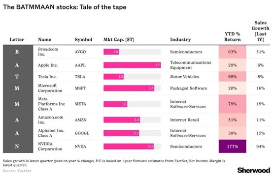 2024年,以BATMMAAN为首的科技巨头们股价不断攀升,如下图所示: