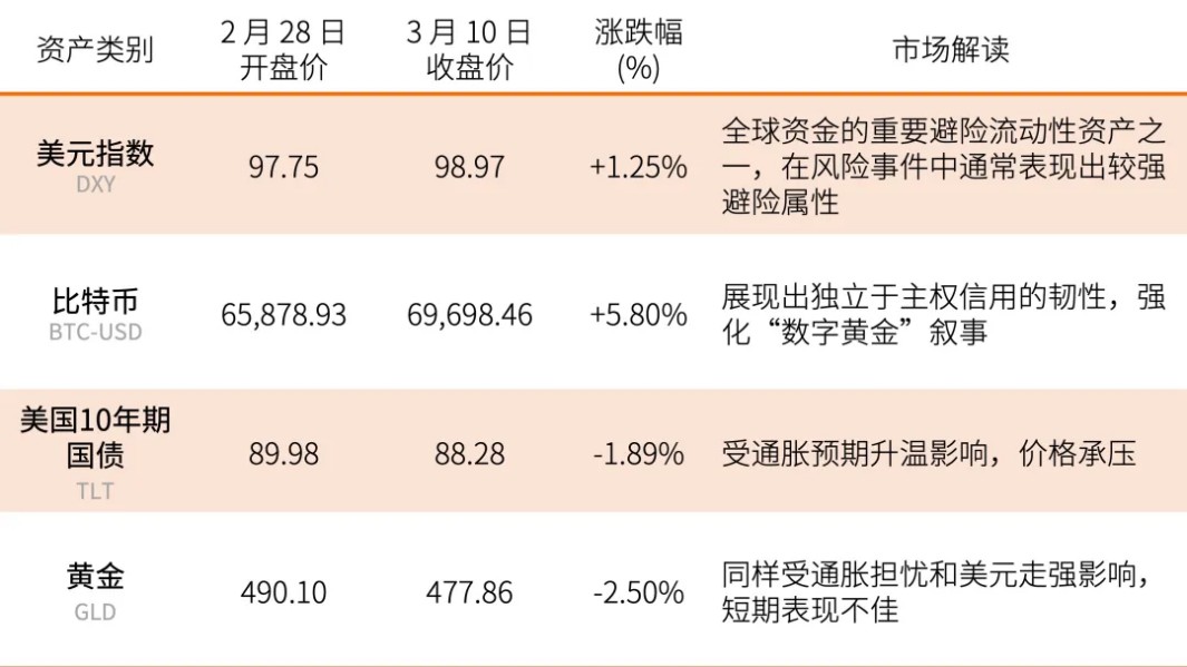 在深入理论分析之前,让我们先用真实的市场数据,对这四类资产在危机爆发后(2 月 28 日至 3 月 10 日)的表现进行一次“压力测试”: