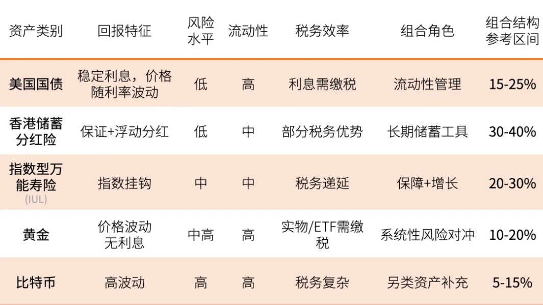 基于以上分析和市场表现,我们对不同资产在避险组合中的功能定位进行了示意性梳理。以下区间仅为示意性研究框架,用于说明不同资产在组合中的潜在功能定位,不构成针对任何投资者的具体资产配置建议。不同投资者的资产配置比例应根据风险承受能力、投资期限及法律税务环境等因素进行个性化调整。