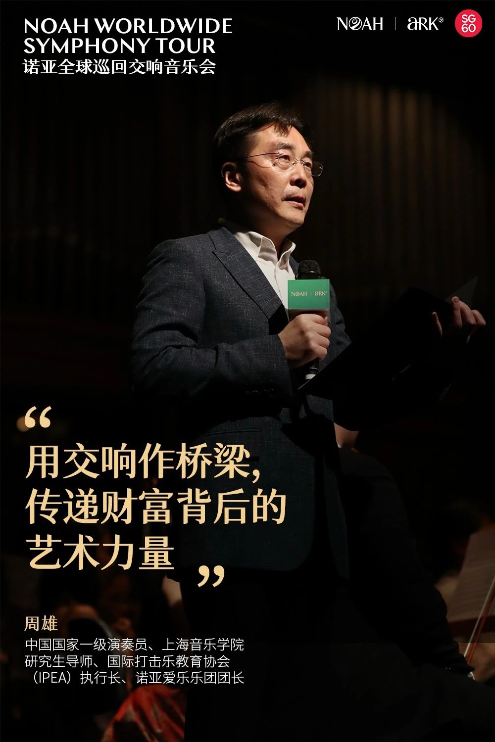 在中国国家一级演奏员、上海音乐学院研究生导师、国际打击乐教育协会(IPEA)执行长、诺亚爱乐乐团团长周雄先生的带领下,诺亚爱乐乐团倾情演绎出“财富背后的艺术力量”。观众随着热烈而细腻的旋律,步入一个跨越时代、连接文化的精神世界,在共鸣中触摸永恒。
