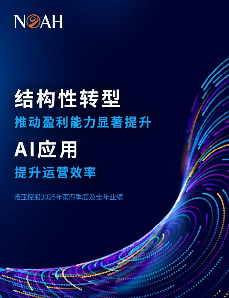 2026年3月25日,诺亚控股(下称“诺亚”或“公司”)(NYSE: NOAH,HKEX: 6686)公布截至2025年12月31日止第四季度及全年未经审计财务业绩。公司是一家领先的财富管理服务提供商,主要面向全球华人高净值人群,提供全球投资与资产配置的一站式综合顾问服务。