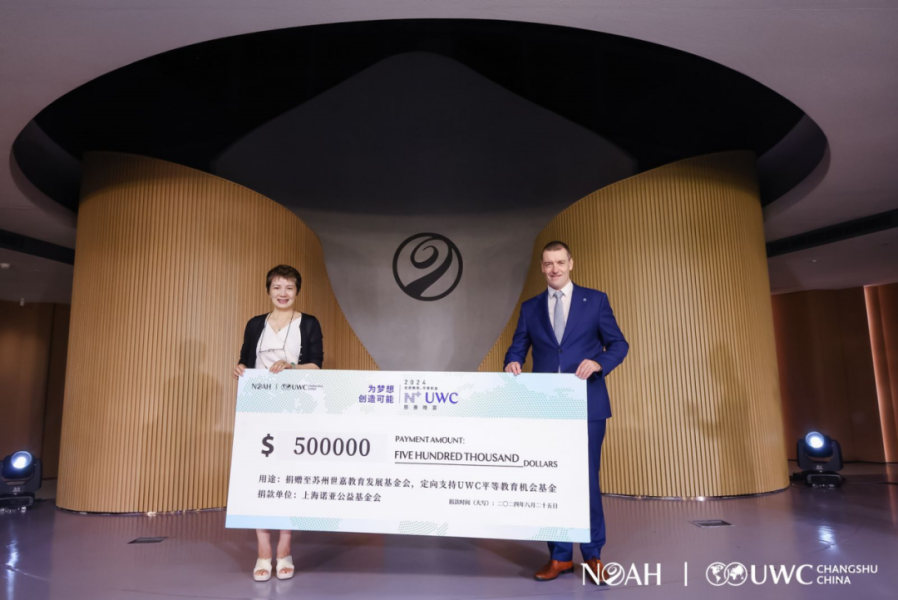 在「为梦想创造可能」公益慈善晚宴上,诺亚公益基金会捐赠50万美金善款,用于常熟UWC学生助学金项目